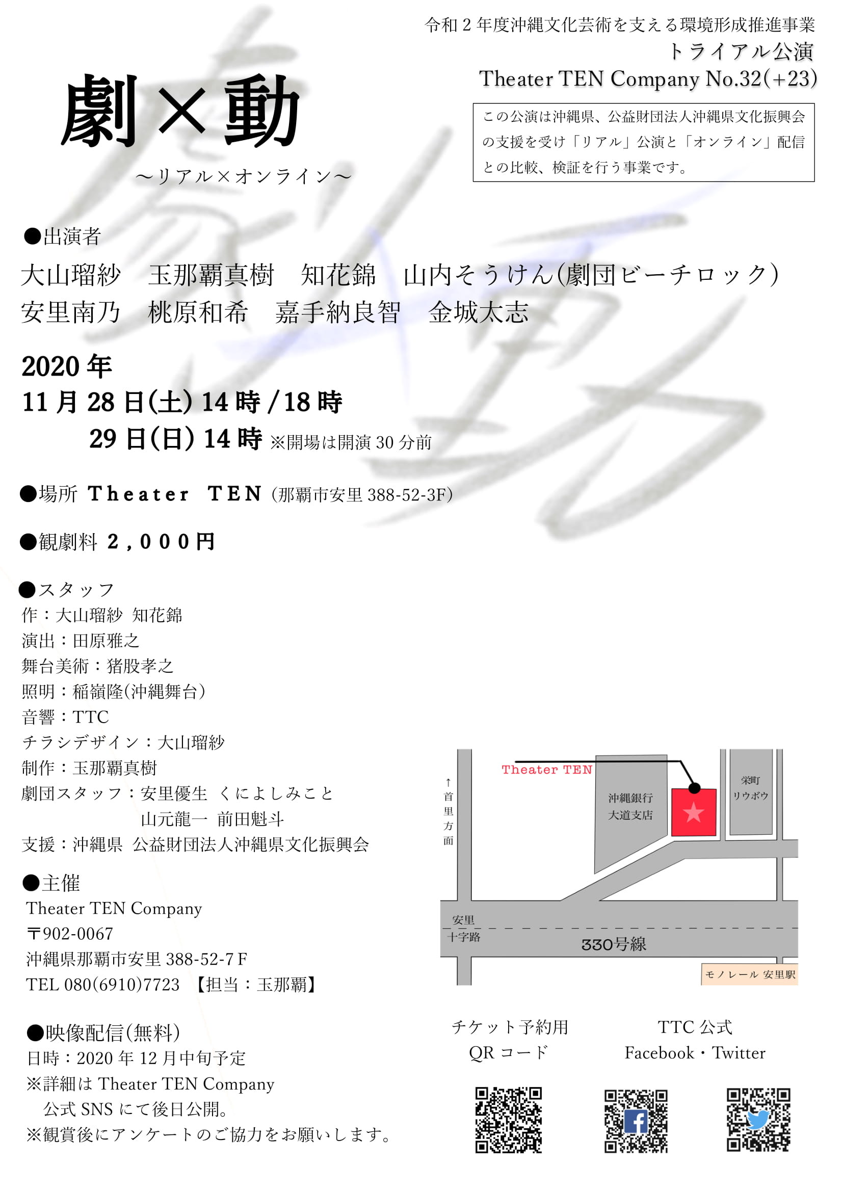 令和2年度沖縄文化芸術を支える環境形成推進事業 トライアル公演 Theater TEN Company No.32(+23) 『劇×動』 作 大山瑠紗 安里優生 桃原和希 知花錦 演出 田原雅之 ☆上演日時 2020年 11月28日(土)14:00 18:00 11月29日(日)14:00 ☆映像配信日時 2020年 12月12日(土)〜12月16日(水) ※無料 ☆場 所 Theater TEN(那覇市安里388-52 3F) ☆料 金 2,000円 ☆出 演 者 大山瑠紗 玉那覇真樹 知花錦 山内そうけん(劇団ビーチロック) 安里南乃 桃原和希 嘉手納良智 金城太志 ☆スタッフ 作 大山瑠紗 知花錦 演出 田原雅之 舞台美術 猪股孝之 照明 稲嶺隆(沖縄舞台) チラシデザイン 大山瑠紗 劇団スタッフ 安里優生 くによしみこと 山元龍一 前田魁斗 制作 玉那覇真樹 主催 Theater TEN Company 支援 沖縄県 公益財団法人沖縄県文化振興会