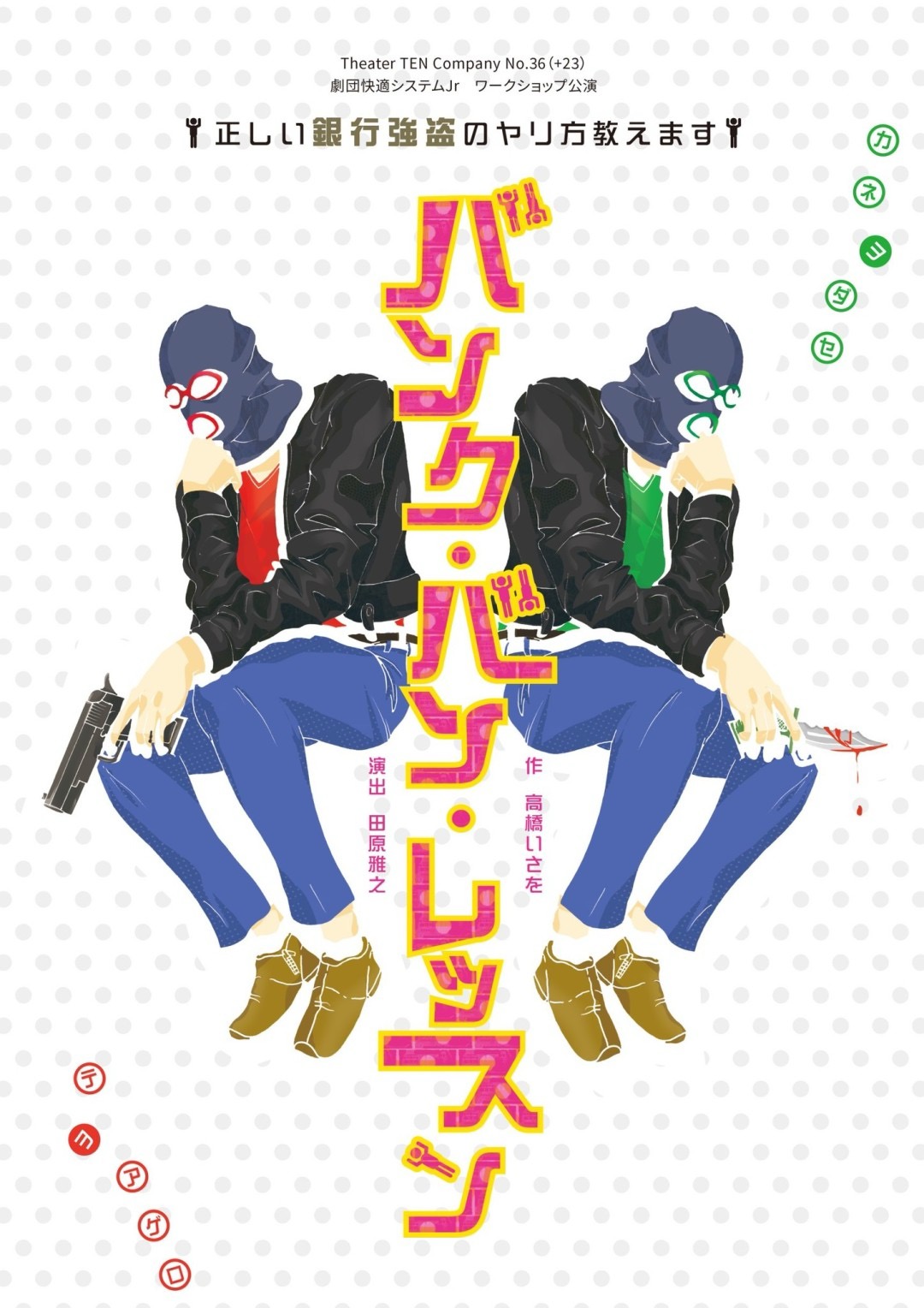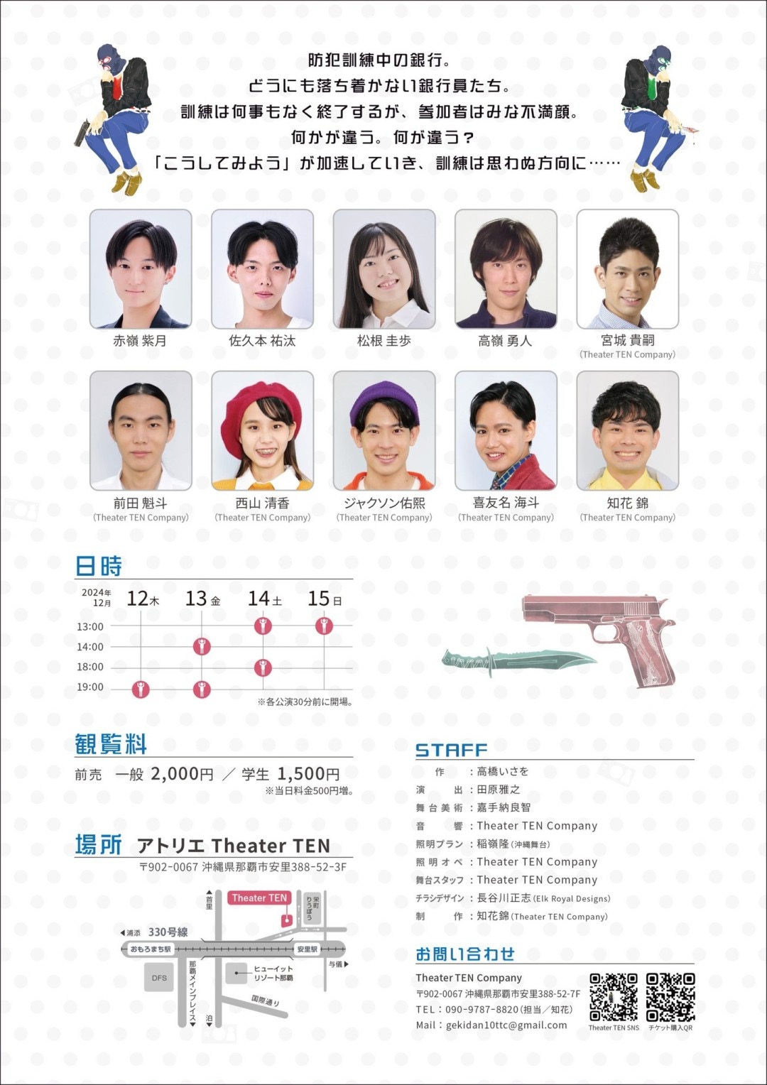 Theater TEN Company No.36(+23) 劇団快適システムJr ワークショップ公演 『バンク・バン・レッスン』 作:高橋いさを 演出:田原雅之 日時 12月12日(木)19:00 12月13日(金)14:00/19:00 12月14日(土)13:00/18:00 12月15日(日)13:00 ※各公演30分前に開場 観覧料 前売 一般2,000円 学生1,500円 ※当日500円増。 場所 アトリエTheater TEN 〒902-0067 沖縄県那覇市安里388-52-3F CAST 赤嶺紫月 佐久本裕汰 松根圭歩 高嶺勇人 宮城貴嗣(Theater TEN Company) 前田魁斗(Theater TEN Company) 西山清香(Theater TEN Company) ジャクソン佑熙(Theater TEN Company) 喜友名海斗(Theater TEN Company) 知花錦(Theater TEN Company) STAFF 作:高橋いさを 演出:田原雅之 舞台美術:嘉手納良智 音響:Theater TEN Company 照明プラン:稲嶺隆(沖縄舞台) 照明オペ:Theater TEN Company 舞台スタッフ:Theater TEN Company チラシデザイン:長谷川正志(Elk Royal Desings) 制作:知花錦(Theater TEN Company) お問い合わせ Theater TEN Company 〒902-0067 沖縄県那覇市安里388-52-7F TEL:090-9787-8820 Mail:gekidan10stt@gmail.com