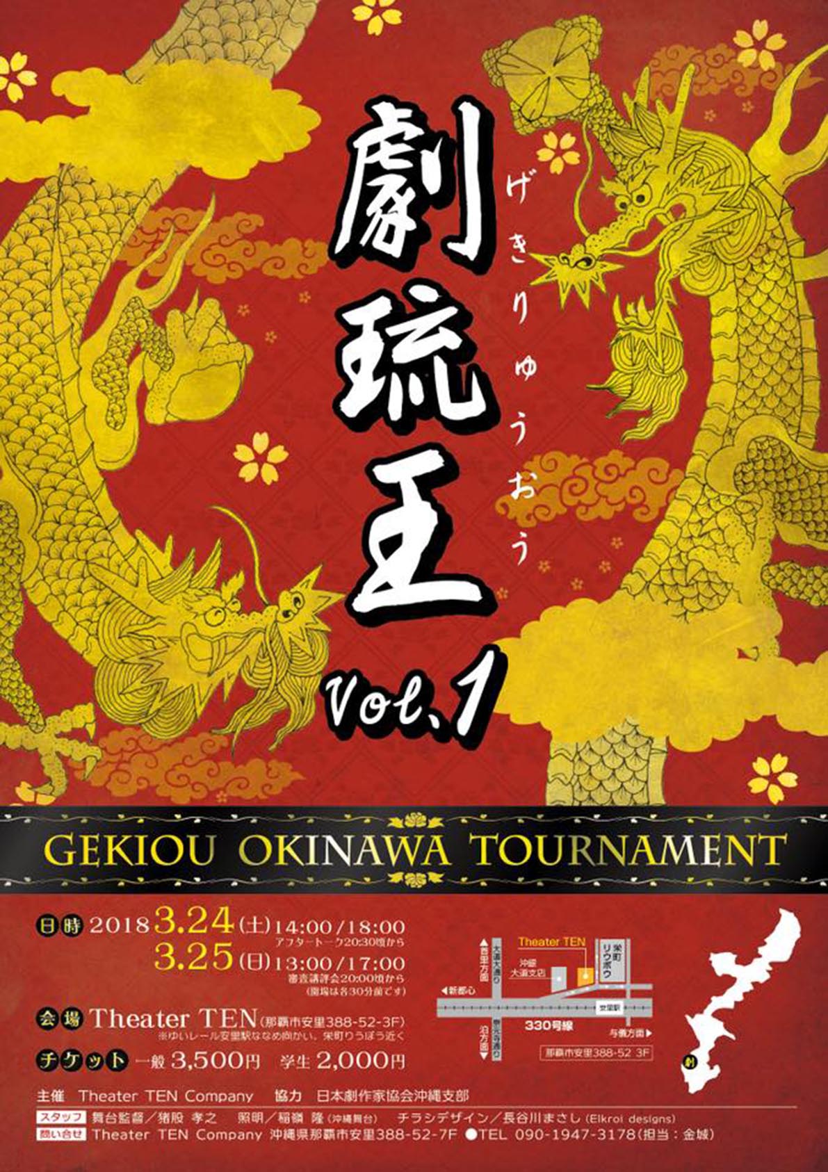 『劇琉王 Vol.1』 ☆上演日時 2018年 3月24日(土)14:00 18:00 3月25日(日)13:00 17:00 ☆場 所 Theater TEN(那覇市安里388-52 3F) ☆料 金 一般 3,500円 学生 2,000円 ☆上演作品 チーム名 ANO 『罪と×(バツ)』 作 犬養憲子(演劇きかく「満福中枢」) 演出 大浜暢裕(HYTTAD) 出演 犬養憲子(演劇きかく「満福中枢」) ARIA チーム名 劇団ビーチロック 『老いとAI』 作・演出 新井章仁(劇団ビーチロック) 出演 ジョーイ大鵞(劇団ビーチロック) 片山英紀(劇団ビーチロック) 三井錬人(劇団ビーチロック) チーム名 P.D.F(Prime Dream Factory) 『〜blind beliebers〜』 作 久保深樹(劇団「きみとぼく」) 出演 ASAMI VICTORIA(INFRONT PRODUCTION) 夢乃 チーム名 Team mishmash(ミシュマッシュ) 『10億』 作・演出 国吉誠一郎 出演 円満離婚 山元龍一(Theater TEN Company) 国吉誠一郎 チーム名 @沖縄向上委員会Z 『生きものの選択』 作 我那覇孝淳 演出 田原雅之(Theater TEN Company) 出演 新垣正弘 当銘由亮 安次嶺正美(敏風利美の会) ☆審 査 員 丸尾聡 佃典彦(劇団B級遊撃隊) ☆スタッフ 舞台監督 猪股孝之 照明 稲嶺隆(沖縄舞台) チラシデザイン 長谷川まさし(Elkroi designs) 主催 Theater TEN Company 協力 日本劇作家協会沖縄支部
