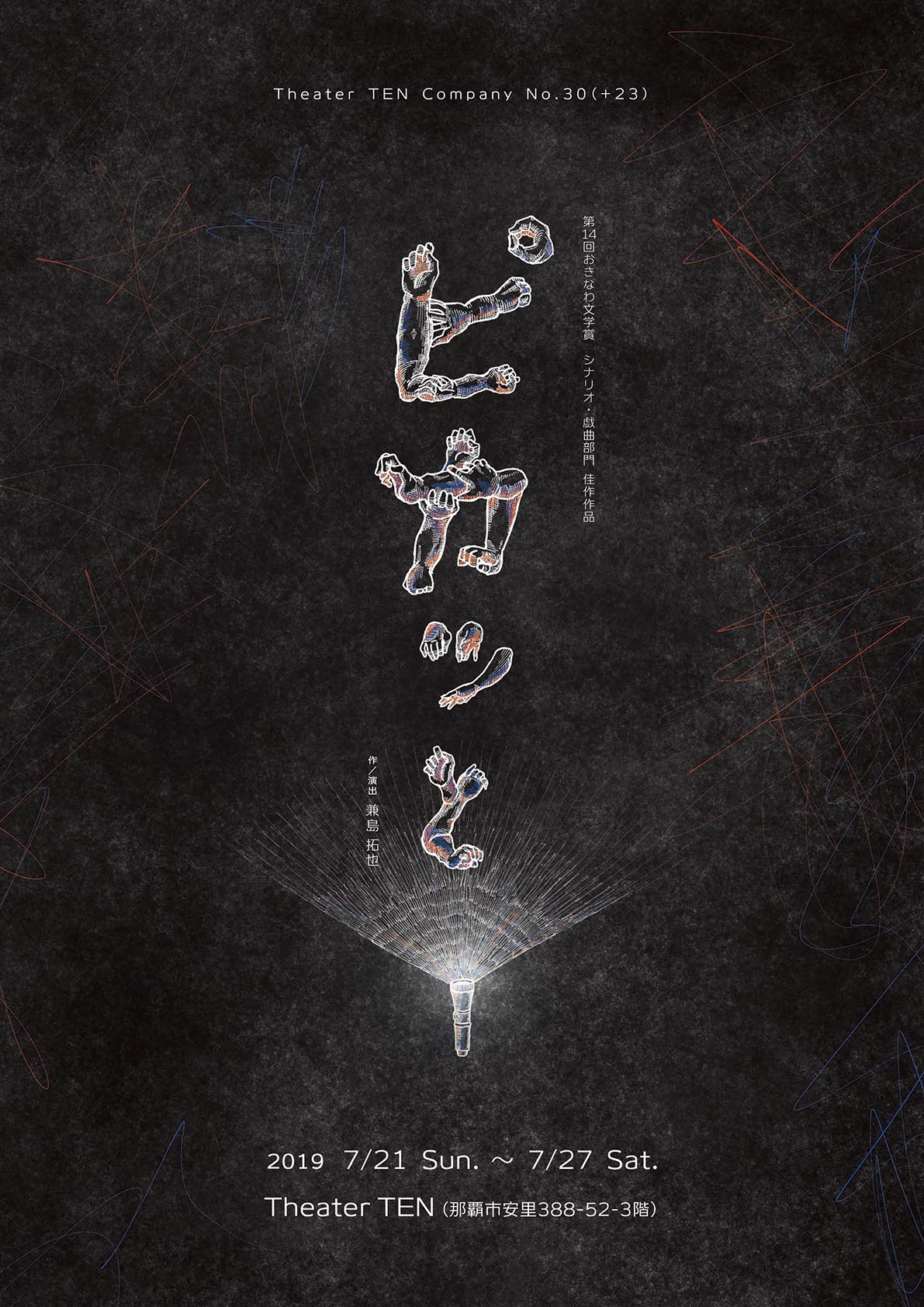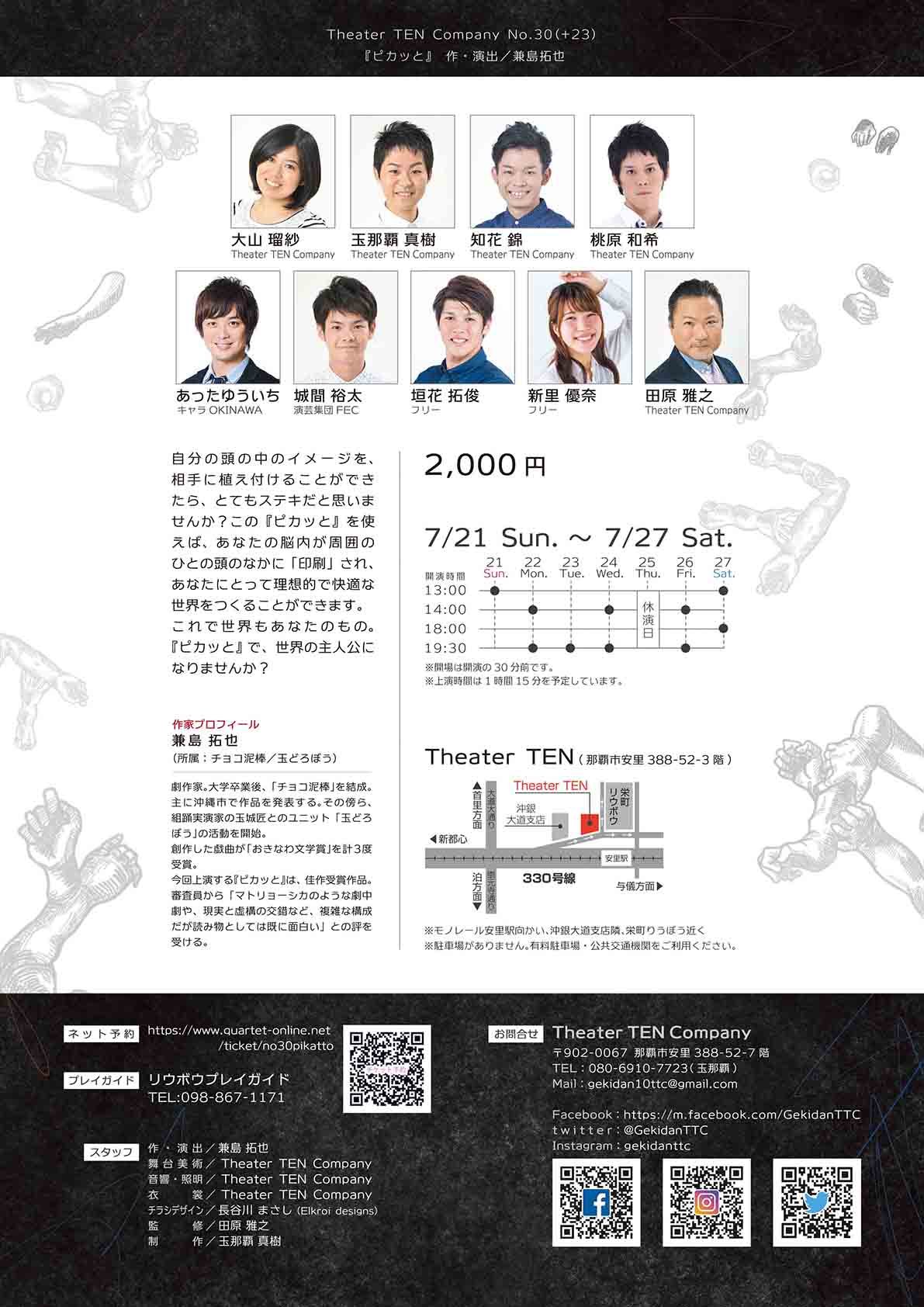 Theater TEN Company No.30(+23) 『ピカッと』 作・演出/兼島拓也 ☆上演日時 2019年 7月21日(日)13:00 7月22日(月)14:00 19:30 7月23日(火)19:30 7月24日(水)14:00 19:30 7月25日(木)休演日 7月26日(金)14:00 19:30 7月27日(土)13:00 18:00 ☆場 所 Theater TEN(那覇市安里388-52 3F) ☆料 金 2,000円 ●プレイガイド リウボウプレイガイド TEL:098-867-1171 ☆出 演 者 大山瑠紗 玉那覇真樹 知花錦 桃原和希 あったゆういち(キャラOKINAWA) 城間裕太(演芸集団FEC) 垣花拓俊(フリー) 新里優奈(フリー) 田原雅之 ☆スタッフ 作・演出 兼島拓也 チラシデザイン 長谷川 まさし(Elkroi designs) 監修 田原雅之 制作 玉那覇真樹